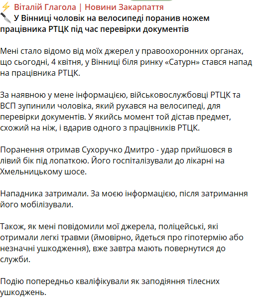"Это произошло сегодня, 4 апреля, в Виннице возле рынка "Сатурн". По имеющейся у меня информации, военнослужащие ТЦК остановили мужчину, который ехал на велосипеде, для проверки документов. В какой-то момент тот достал предмет, похожий на нож, и ударил одного из сотрудников ТЦК. Получил ранение Сухоручко Дмитрий - удар пришелся в левый бок под лопаткой. Его госпитализировали в больницу на Хмельницком шоссе", - пишет Глагола в своем телеграм-канале.