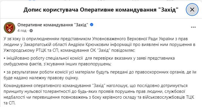 Позже украинское командование заявило о проверке Ужгородского ТЦК после скандала с условиями содержания мобилизованных.