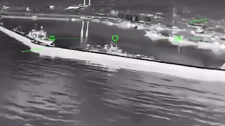 Бровди опубликовал видео удара, на котором дрон приближается к кораблю, но момента попадания нет. Кроме того, на кадрах видны попадания по плавучей буровой установке "Сиваш".