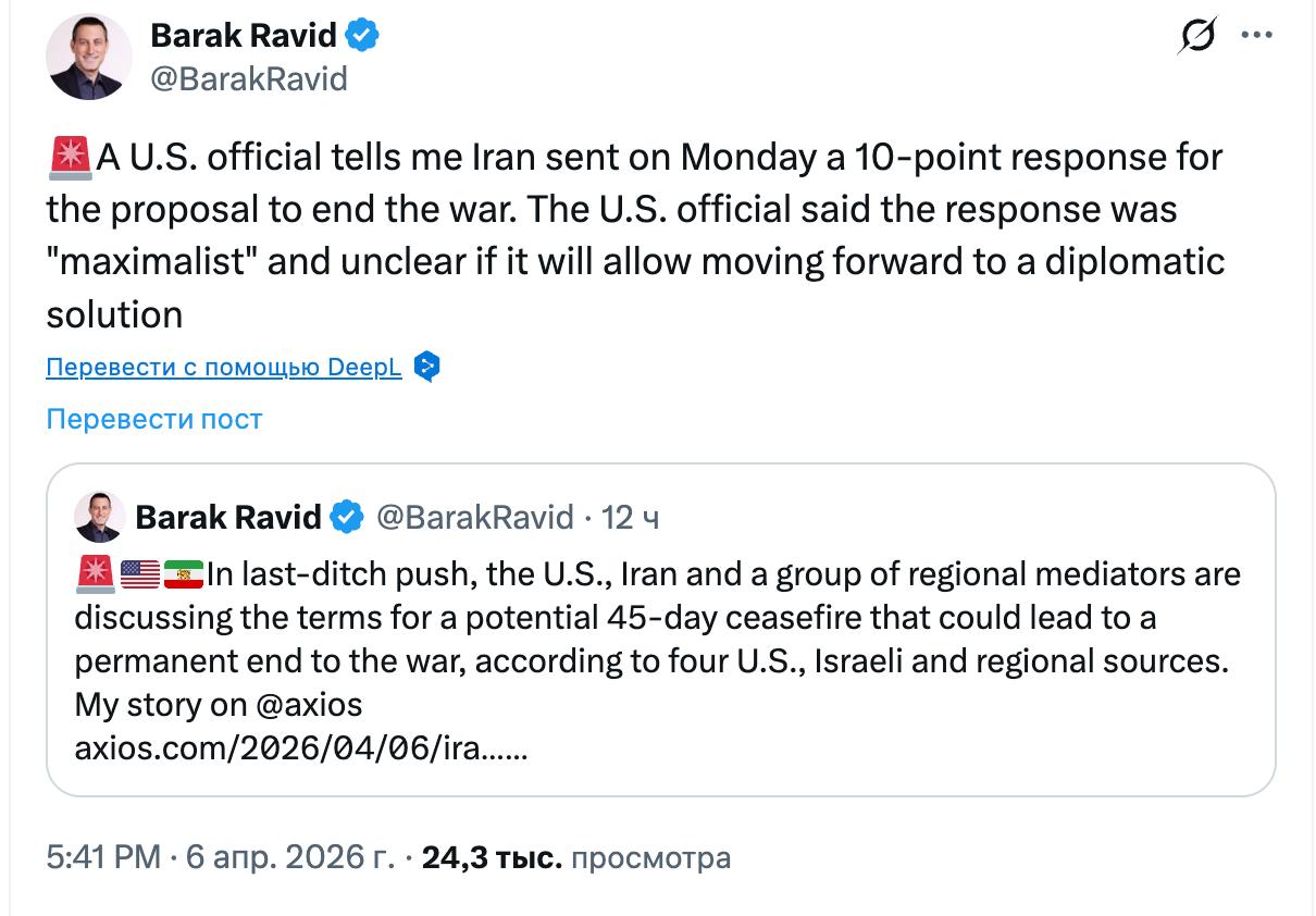 В свою очередь американский чиновник заявил журналисту Axios Бараку Равиду, что ответ Ирана был "максималистским" и неясно, позволит ли он продвинуться к дипломатическому решению.