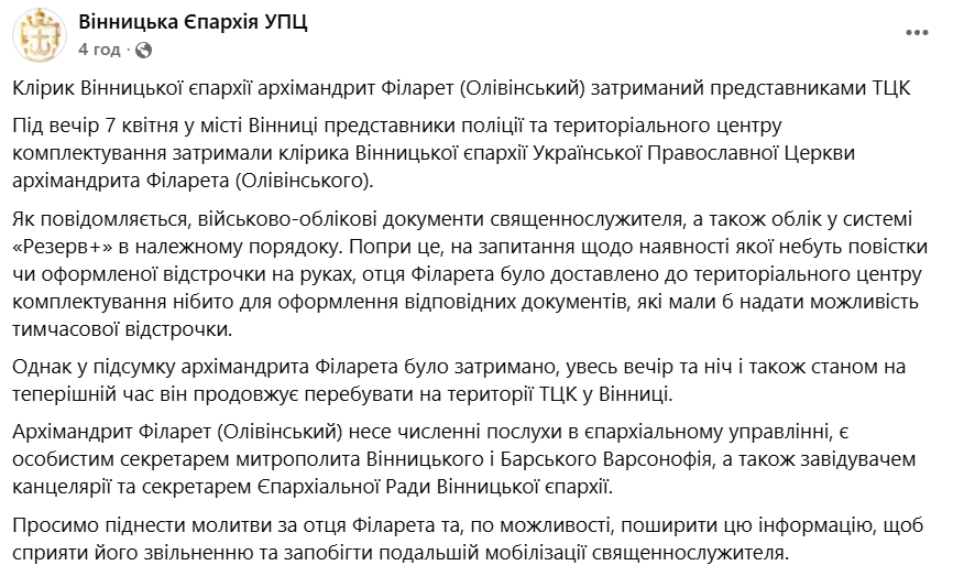 Вчера вечером сотрудники территориального центра комплектования и социальной поддержки задержали архимандрита Винницкой епархии Украинской православной церкви Филарета (Оливинского).