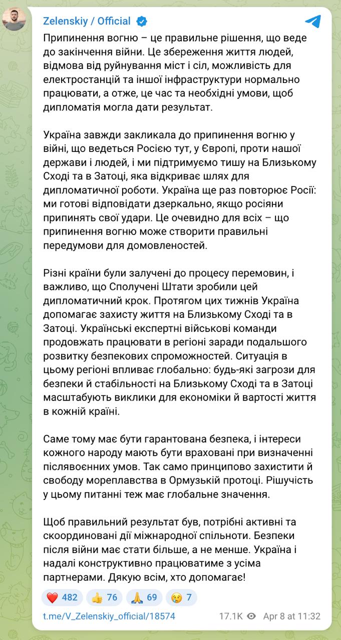 "Прекращение огня - это правильное решение, которое ведёт к окончанию войны. Это сохранение жизней людей, отказ от разрушения городов и сёл, возможность для электростанций и другой инфраструктуры работать в нормальном режиме. А значит, это время и необходимые условия, чтобы дипломатия могла дать результат. Украина всегда призывала к прекращению огня в войне, которую ведёт Россия здесь, в Европе, против нашего государства и нашего народа. Украина ещё раз повторяет России: мы готовы отвечать зеркально, если россияне прекратят свои удары. Это очевидно для всех: прекращение огня может создать правильные предпосылки для договорённостей", - написал президент.