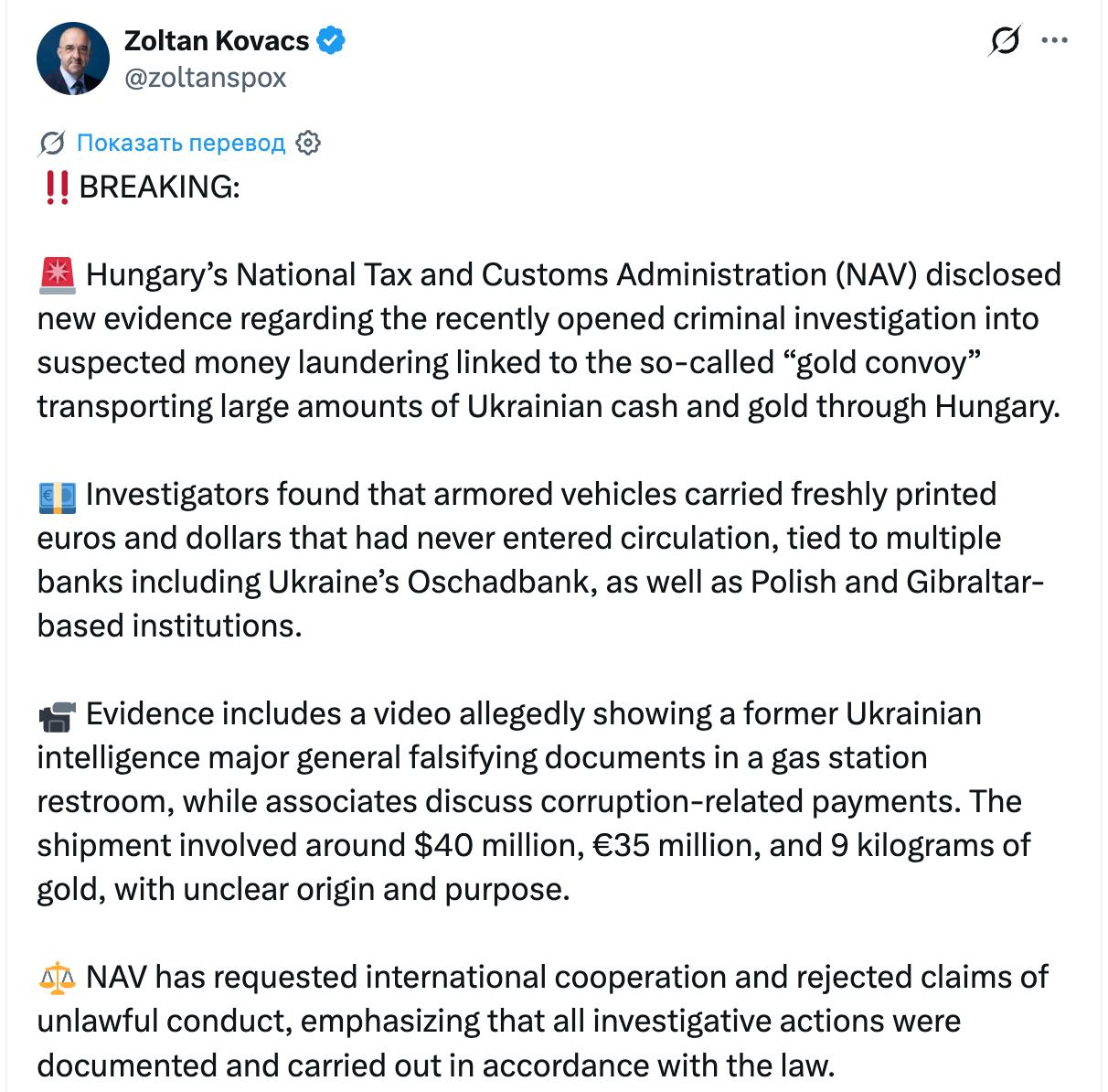 "Следователи установили, что в бронированных автомобилях перевозили свежеотпечатанные евро и доллары, которые никогда не поступали в обращение и были связаны с несколькими банками, включая украинский Ощадбанк, а также польские и гибралтарские финансовые учреждения. Среди доказательств - видеозапись, на которой запечатлен бывший генерал-майор украинской разведки, подделывающий документы в туалете автозаправочной станции, в то время как его сообщники обсуждают платежи, связанные с коррупцией", - сообщил Ковач.