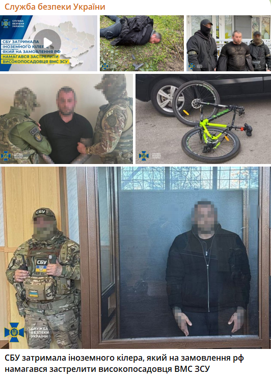Опубликовано видео, на котором мужчина на велосипеде останавливается у шлагбаума жилого комплекса, к которому вскоре подъезжает автомобиль. Мужчина бросает велосипед под машину, та резко останавливается. Как заявляет СБУ, в этот момент киллер пытался выстрелить в офицера за рулем, но его задержали.