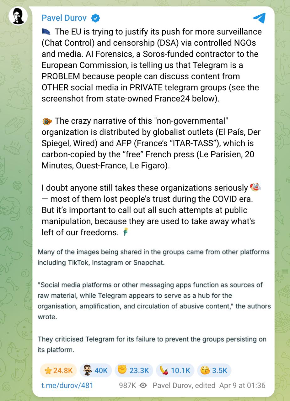 "ЕС пытается оправдать своё стремление к усилению слежки (Chat Control) и цензуры (DSA) через контролируемые НПО и СМИ. AI Forensics, подрядчик Европейской комиссии, финансируемый Соросом, заявляет, что Telegram - это проблема, потому что люди могут обсуждать контент из других социальных сетей в приватных группах Telegram. Сомневаюсь, что кто-то ещё серьёзно воспринимает эти организации, большинство из них потеряли доверие людей во время эпохи COVID. Но важно разоблачать все такие попытки общественной манипуляции, потому что они используются, чтобы отнять то, что осталось от наших свобод", - прокомментировал ситуацию Дуров.