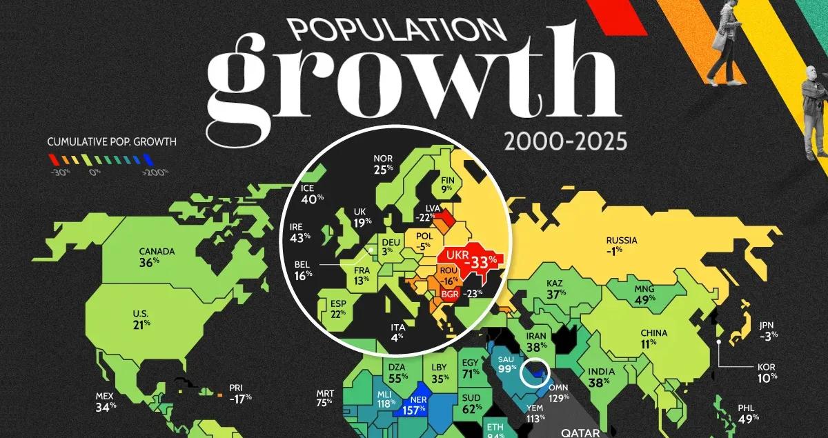 При этом, по данным МВФ, за 2000–2025 годы население планеты в среднем увеличилось на 46,6%, однако этот рост распределяется крайне неравномерно.