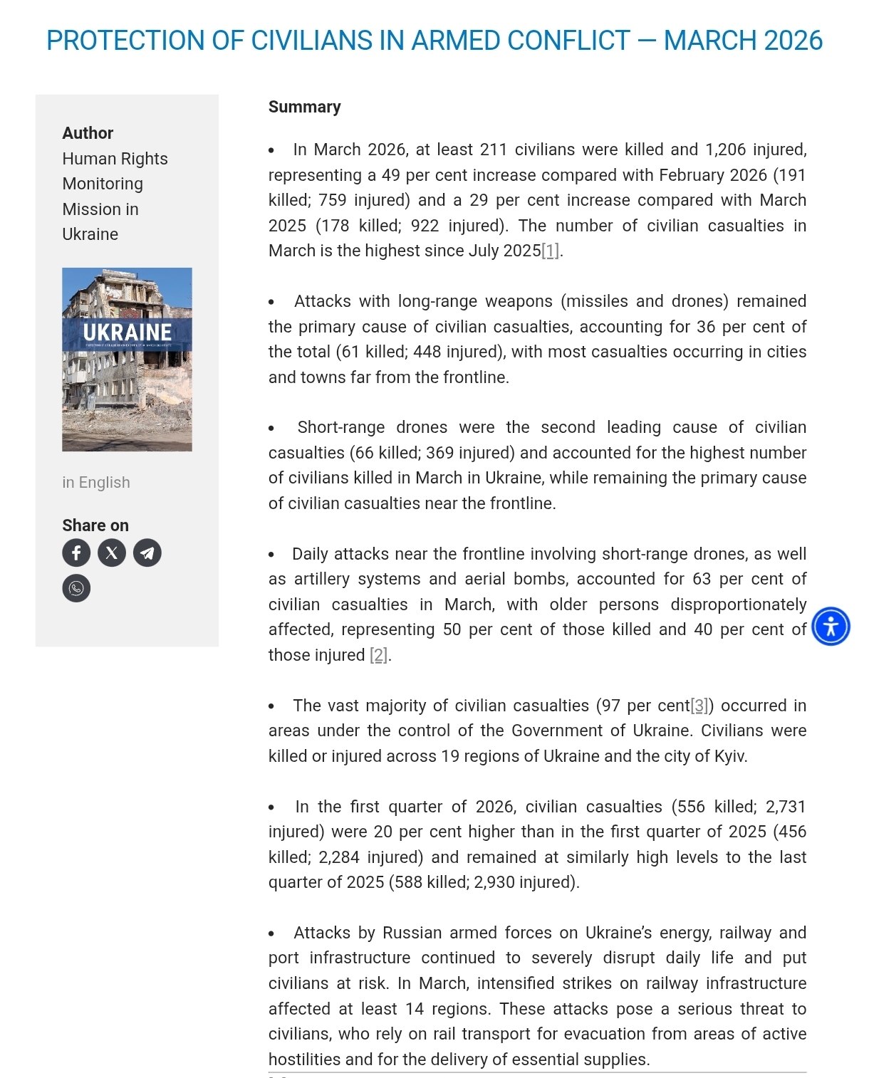 В миссии заявили, что количество жертв таких атак существенно выросло за последние два года. В 2025 году этот показатель был на 121% выше, чем в 2024 году, а в марте 2026 года увеличился на 70% по сравнению с мартом 2025 года.