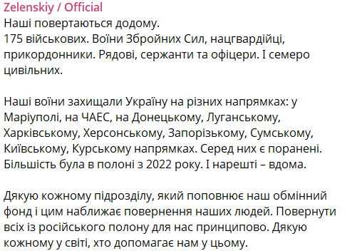 "Наши возвращаются домой. 175 военнослужащих. Воины Вооружённых сил, нацгвардейцы, пограничники. Рядовые, сержанты и офицеры. И семь гражданских. Наши воины защищали Украину на разных направлениях: в Мариуполе, на ЧАЭС, на Донецком, Луганском, Харьковском, Херсонском, Запорожском, Сумском, Киевском, Курском направлениях", - написал Зеленский.