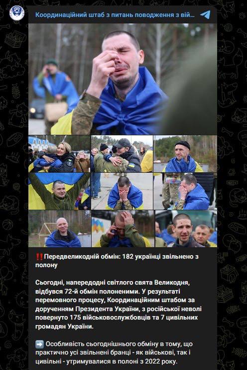 Помимо 175 военных были освобождены также семеро гражданских лиц (отметим, россияне заявляли, что Украина вернула в РФ сегодня семеро гражданских жителей Курской области, то есть, тут также был паритетный обмен).