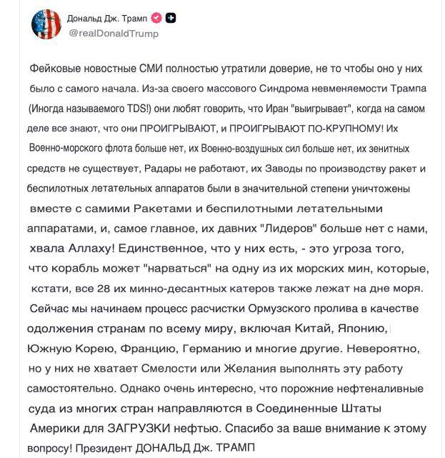 "Единственное, что у них (иранцев - Ред.) есть, - это угроза того, что корабль может "нарваться" на одну из их морских мин, которые, кстати, как все 28 их минно-десантных катеров также лежат на дне моря. Сейчас мы начинаем процесс очищения Ормузского пролива в качестве услуги странам всего мира, включая Китай, Японию, Южную Корею, Францию, Германию и многие другие", - написал Трамп.