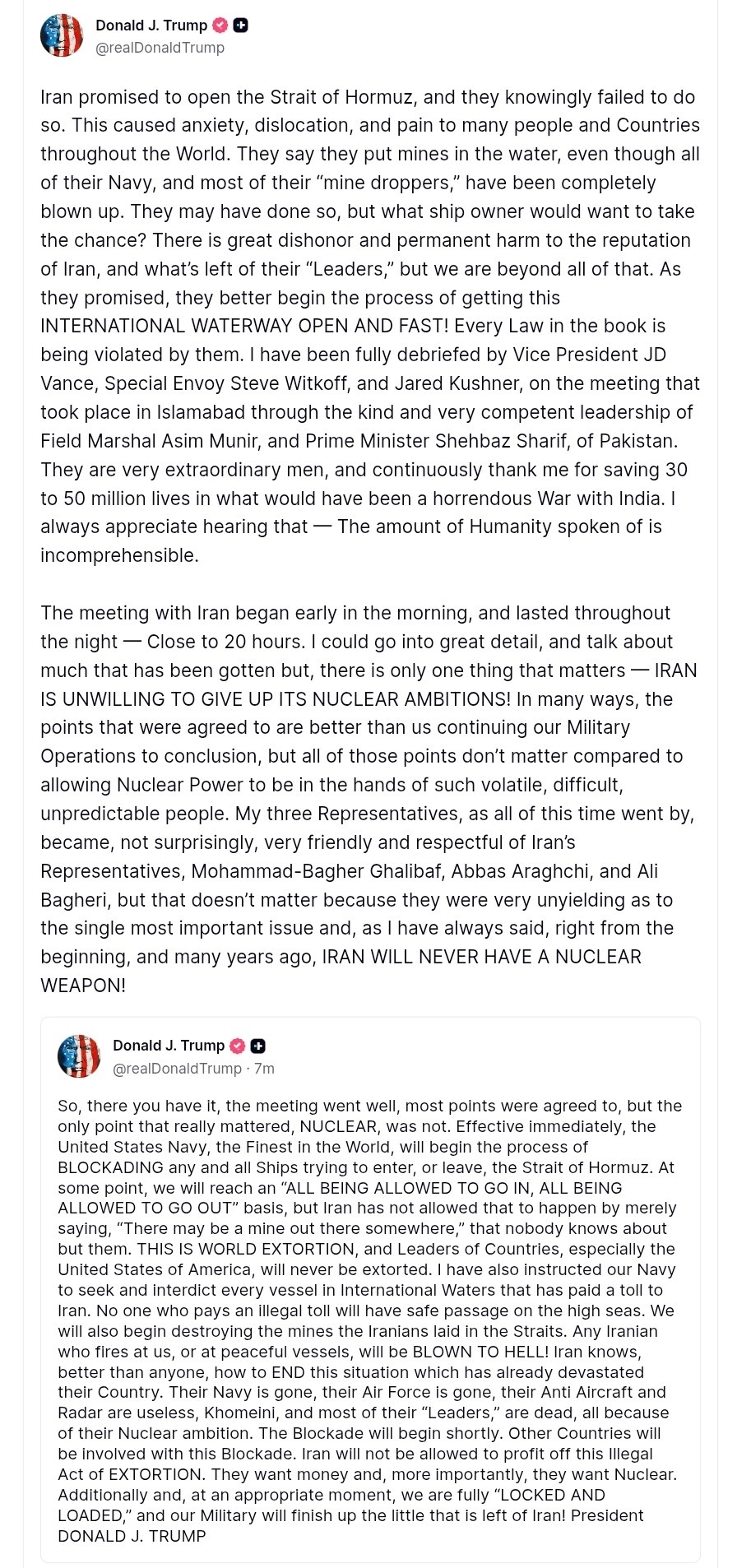 "С этого момента ВМС США начинают процесс блокирования любых судов, пытающихся войти или выйти из Ормузского пролива", - написал он.