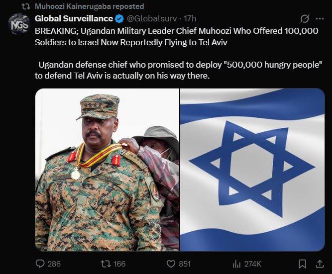Кроме этого, Кайнеругаба предложил отправить в Израиль "500 тысяч голодных людей" для защиты Тель-Авива.