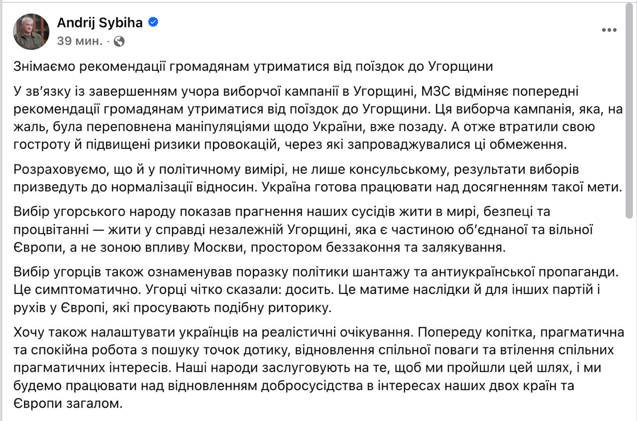 Тем временем Украина отменяет рекомендации своим гражданам воздержаться от поездок в Венгрию "в связи с завершением вчера избирательной кампании". Об этом написал в Фейсбуке глава украинского МИД Андрей Сибига.