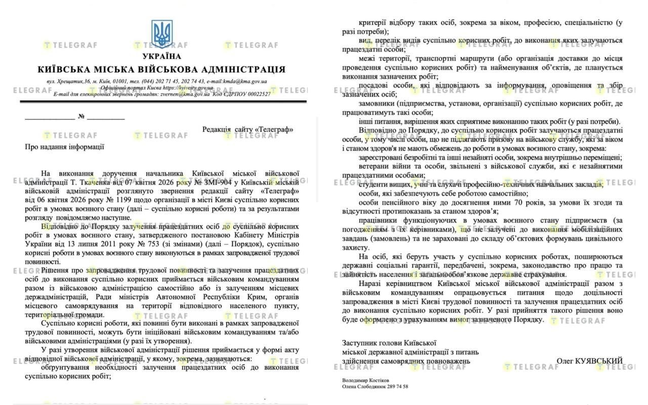 Об этом говорится в ответе Киевской городской военной администрации на запрос СМИ.