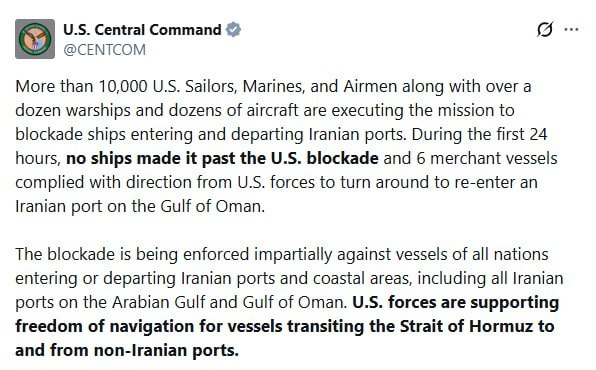 "Более 10 000 американских моряков, морских пехотинцев и лётчиков, а также более десятка военных кораблей и десятки самолётов выполняют миссию по блокаде судов, входящих в иранские порты и выходящих из них. В течение первых 24 часов ни одному судну не удалось прорвать американскую блокаду. Шесть торговых судов выполнили указание американских сил и развернулись, вернувшись в иранский порт в Оманском заливе", - говорится в заявлении CENTCOM.