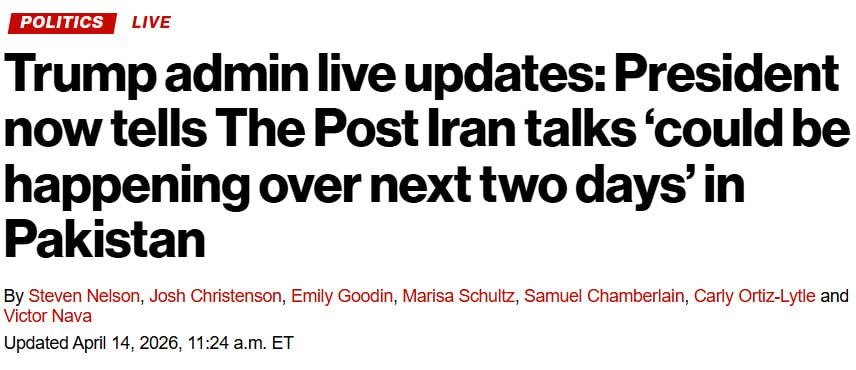 Напомним, накануне о том, что следующий раунд прямых переговоров между Ираном и США состоится в четверг, 16 апреля, в столице Пакистана Исламабаде, сообщил корреспондент журнала The Atlantic Араш Азизи со ссылкой на источник в Тегеране.