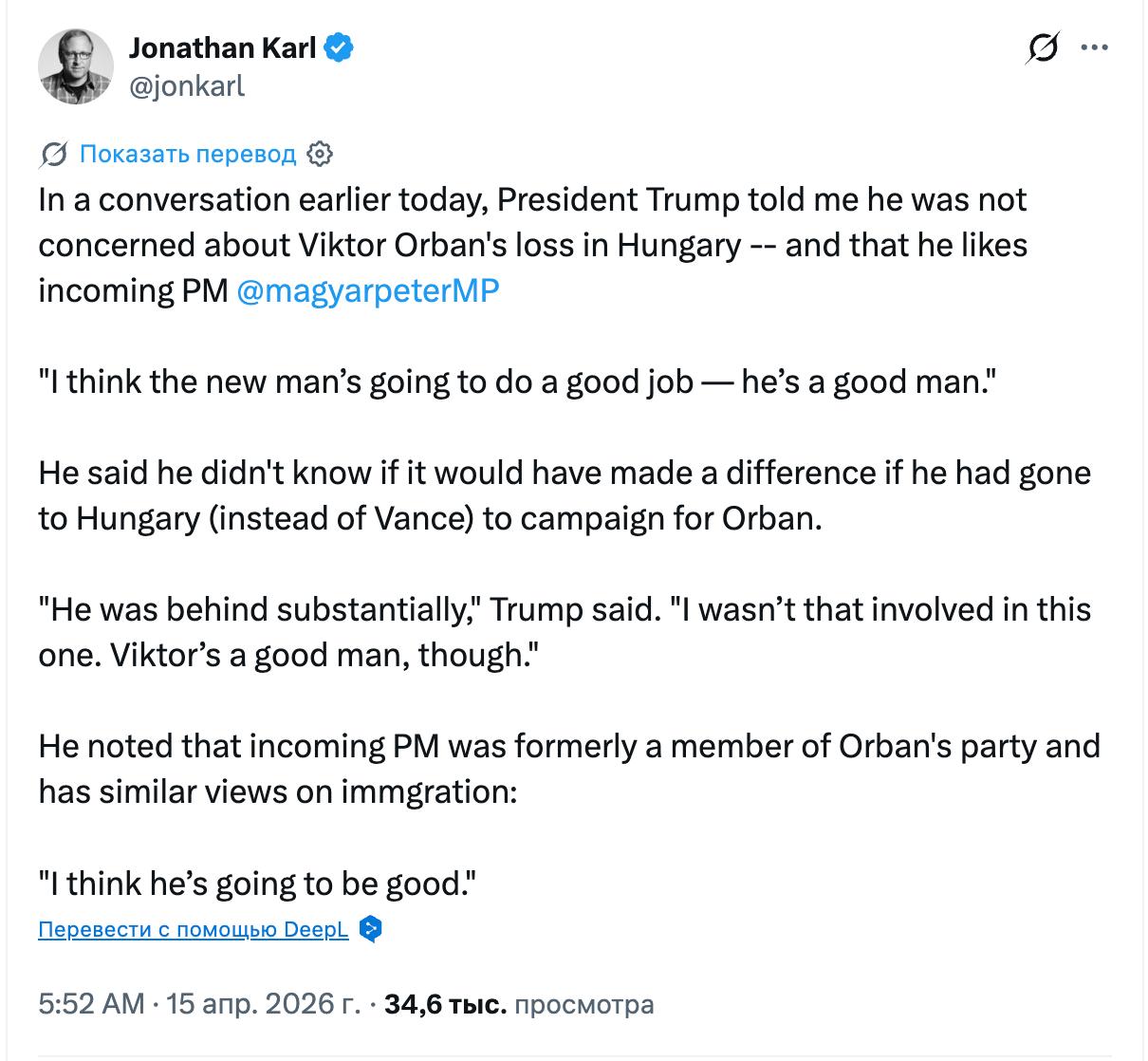 Вчера в интервью итальянской газете глава Белого дома уже комментировал поражение Орбана и называл его хорошим человеком, как теперь Мадьяра.