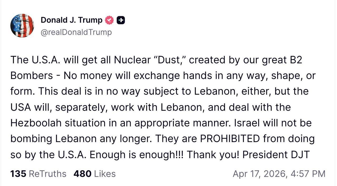 "США получат весь ядерный "пепел", созданный нашими великими бомбардировщиками B2. Никаких денег не будет передано. Эта сделка не касается Ливана, но США будут отдельно работать с Ливаном и решать проблему с "Хезболлой". Израиль больше не будет бомбить Ливан - это запрещено США. Хватит - достаточно", - написал Трамп.