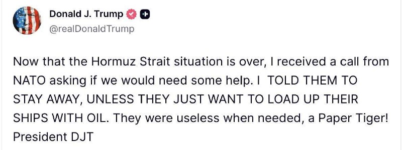 "Теперь, когда ситуация в Ормузском проливе закончилась, мне позвонили из НАТО и спросили, не понадобится ли нам помощь. Я сказал им держаться подальше, если только они не хотят заправить свои корабли нефтью. Они были бесполезны, когда в них нуждались, настоящий "бумажный тигр"! - написал президент США.