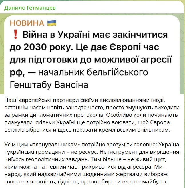 Народный депутат Даниил Гетманцев раскритиковал заявление начальника Генерального штаба Бельгии о том, что Европе выгодно затягивание войны в Украине до 2030 года.