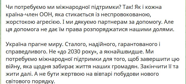 "Устойчивому, надёжному, гарантированному и справедливому. Не "до 2030 года", а как можно скорее... Закончить её (войну, – Ред.) и жить дальше. А не быть жертвой на алтаре построения нового мирового порядка", – добавил он.