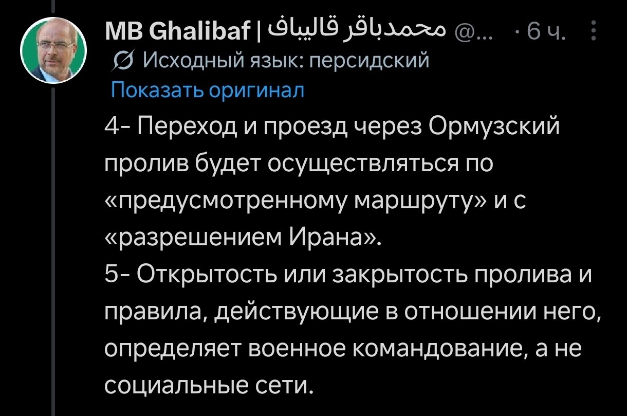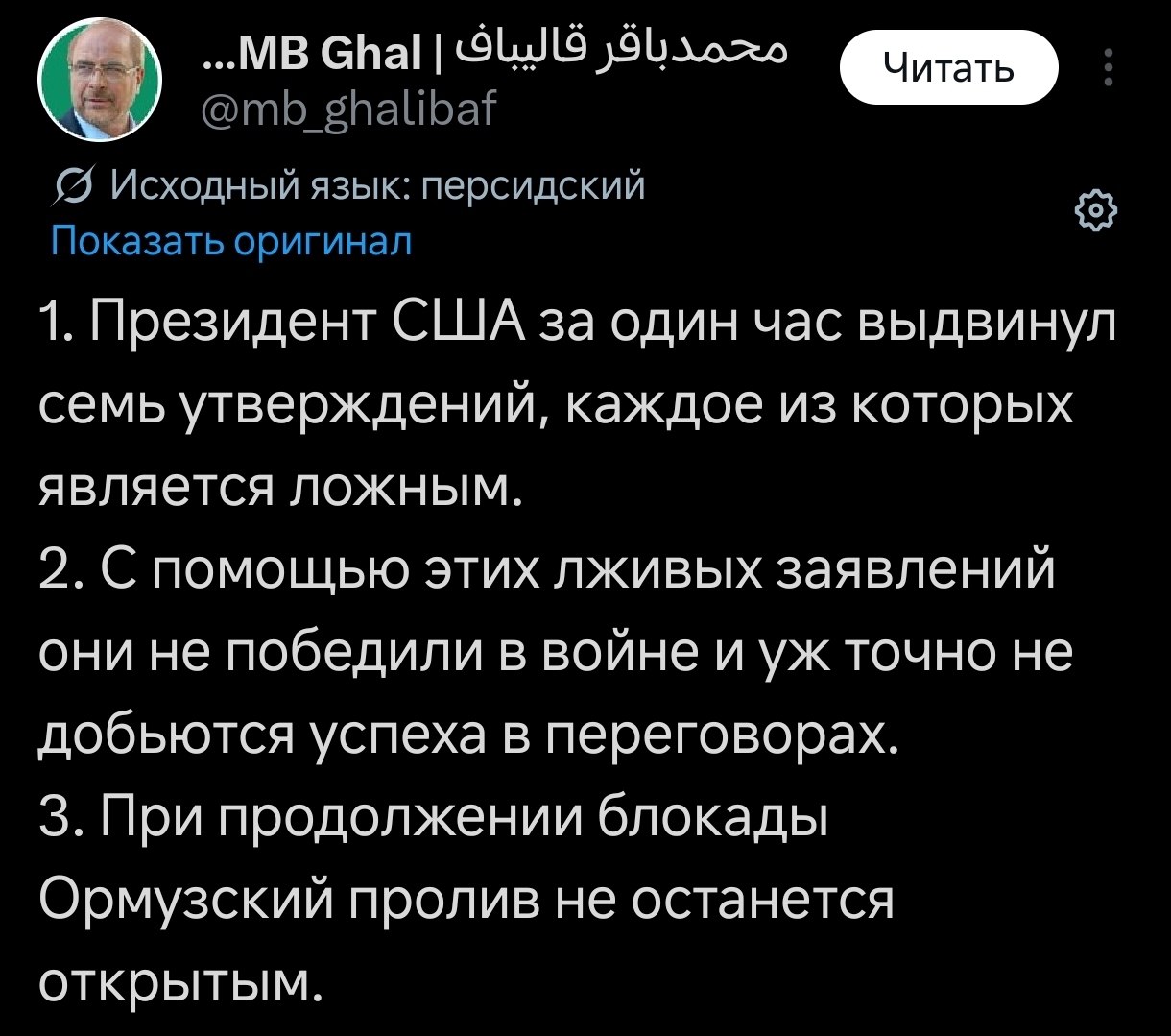 Спикер иранского парламента и глава делегации на переговорах Мохаммад-Багер Галибаф в свою очередь на своей странице в социальной сети Х написал, что Ормузский пролив не будет полноценно открыт, пока сохраняется морская блокада со стороны США.