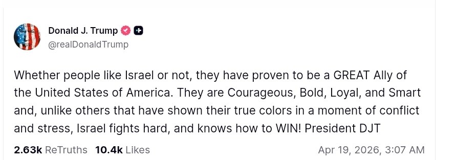 "Нравится людям Израиль или нет, они доказали, что являются великим союзником Соединенных Штатов Америки. Они смелые, решительные, преданные и умные и, в отличие от других, которые показали свое истинное лицо в момент конфликта и стресса, Израиль сражается жестко и знает, как побеждать", - написал президент США.