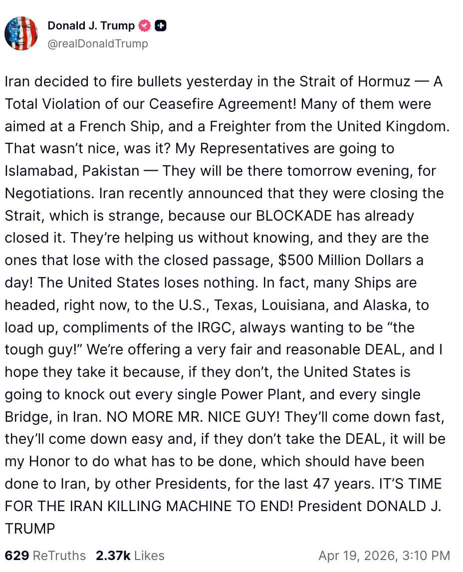 "Мы предлагаем очень честную и разумную сделку, и я надеюсь, что они её примут, потому что, если нет, Соединённые Штаты выведут из строя каждую электростанцию и каждый мост в Иране. Больше никакого "мистера хорошего парня"! Они быстро пойдут на уступки, они легко пойдут на уступки, а если они не примут сделку, для меня будет честью сделать то, что должно быть сделано, что должно было быть сделано с Ираном другими президентами на протяжении последних 47 лет", - написал Трамп.