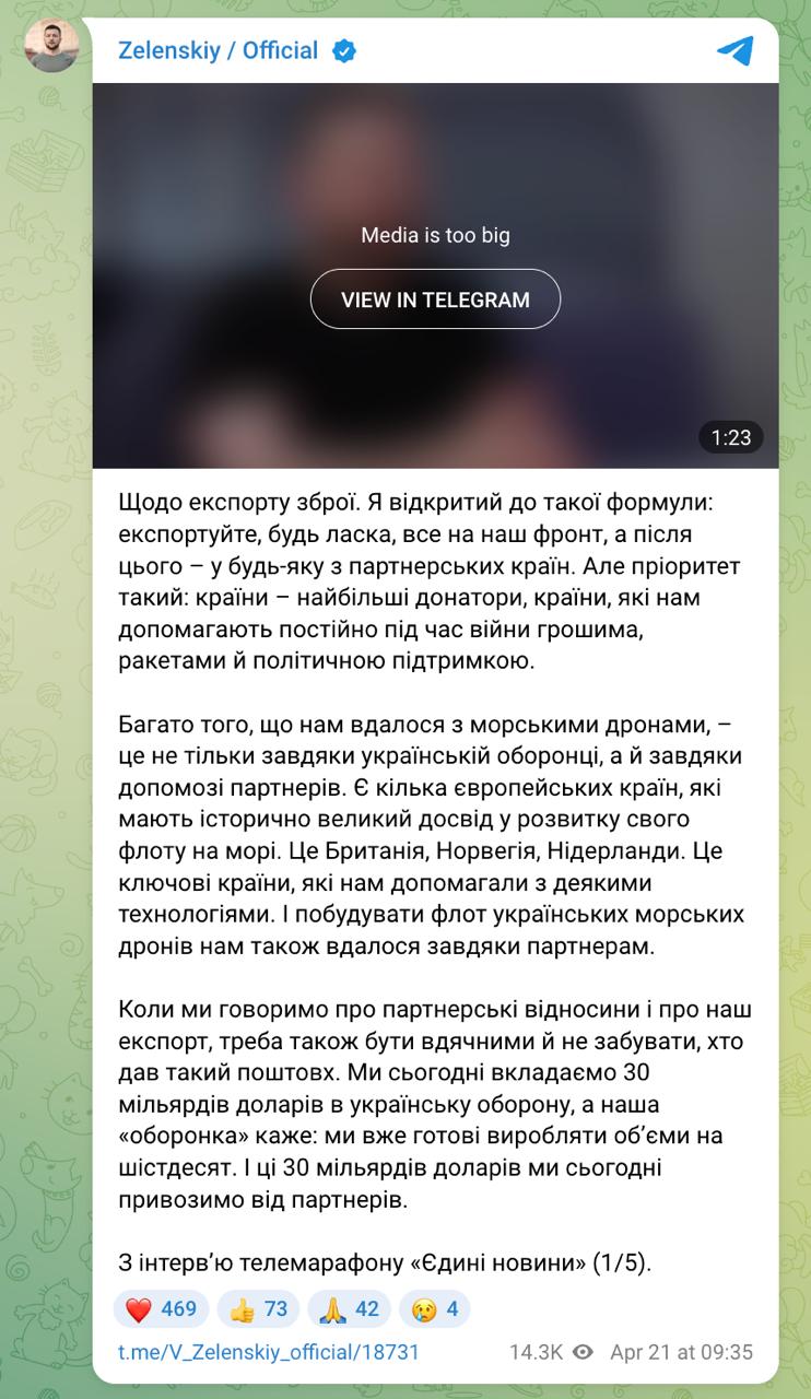 Об этом в интервью телемарафону рассказал президент Владимир Зеленский, о чём впоследствии написал в своём телеграм-канале.