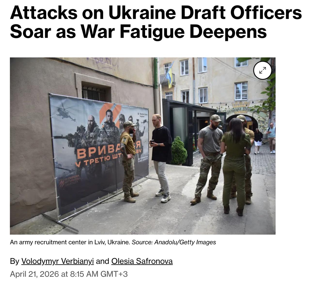 "Непопулярная мобилизация усиливает напряженность в украинском обществе, измученном войной с Россией. Массовое нежелание вступать в армию вызывает гнев среди солдат и семей тех, кто уже взял в руки оружие. Несмотря на то что украинская армия удерживает фронт на востоке и юге, многие измотанные бойцы жалуются на отсутствие ротации, которая позволила бы им восстановить силы. Правительство и парламент с опаской относятся к ужесточению мобилизации, боясь общественной реакции", - говорится в статье.