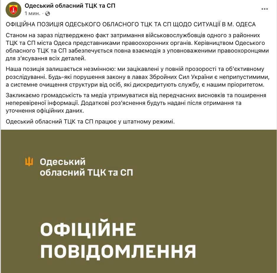 "На данный момент подтвержден факт задержания военнослужащих одного из районных ТЦК и СП города Одессы представителями правоохранительных органов. Руководство Одесского областного ТЦК и СП обеспечивает полное взаимодействие с уполномоченными правоохранителями для выяснения всех деталей. Наша позиция остается неизменной: мы заинтересованы в полной прозрачности и объективном расследовании. Любые нарушения закона в рядах Вооруженных сил Украины недопустимы, а системная очистка структуры от лиц, дискредитирующих службу, является нашим приоритетом. Призываем общественность и СМИ воздерживаться от преждевременных выводов и распространения непроверенной информации. Дополнительные разъяснения будут предоставлены после получения и уточнения официальных данных", - говорится в сообщении ТЦК.