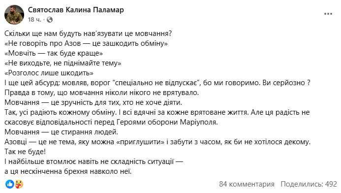 "Сколько нам еще будут навязывать это молчание? "Не говорите об Азове — это повредит обмену", "молчите – так будет лучше", "не выходите, не поднимайте тему", "огласка только вредит". И еще этот абсурд: мол, враг "специально не отпускает", потому что мы говорим. Вы серьезно? Правда в том, что молчание никогда никого не спасло. Молчание – это удобство для тех, кто не хочет действовать", - написал "Калина".