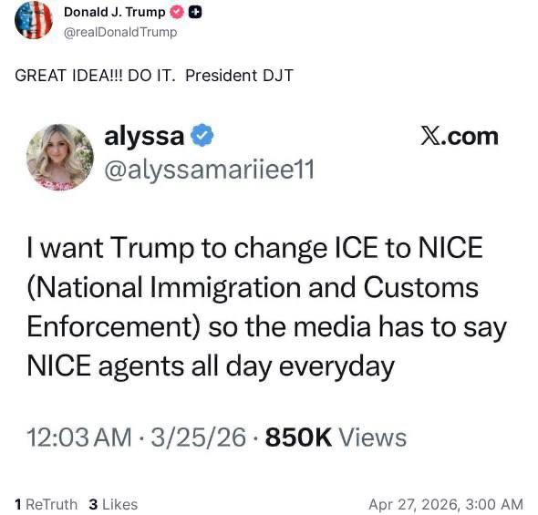 "Я хочу, чтобы Трамп изменил ICE на NICE (National Immigration and Customs Enforcement), чтобы в прессе ежедневно писали о хороших агентах", - написала пользователь по имени Алисса.