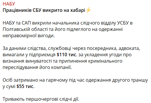По информации Бюро, речь идет о начальнике следственного отдела УСБУ в Полтавской области и его подчиненном, которые через посредника-адвоката требовали от предпринимателя 110 тысяч долларов за заключение соглашения о признании вины и прекращении уголовного преследования его компании.