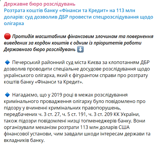 "Печерский районный суд Киева по ходатайству ГБР разрешил проводить специальное досудебное расследование по украинскому олигарху, который является фигурантом дела о растрате средств банка "Финансы и кредит", - говорится в сообщении.