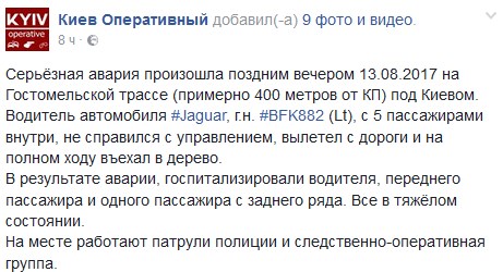 Ночью 12 августа в Киевской области водитель Jaguar на литовских номерах не справился с управлением и въехал в дерево. В результате трое людей пострадали, все они в тяжелом состоянии. Об этом сообщает портал Киев Оперативный на странице в Facebook.