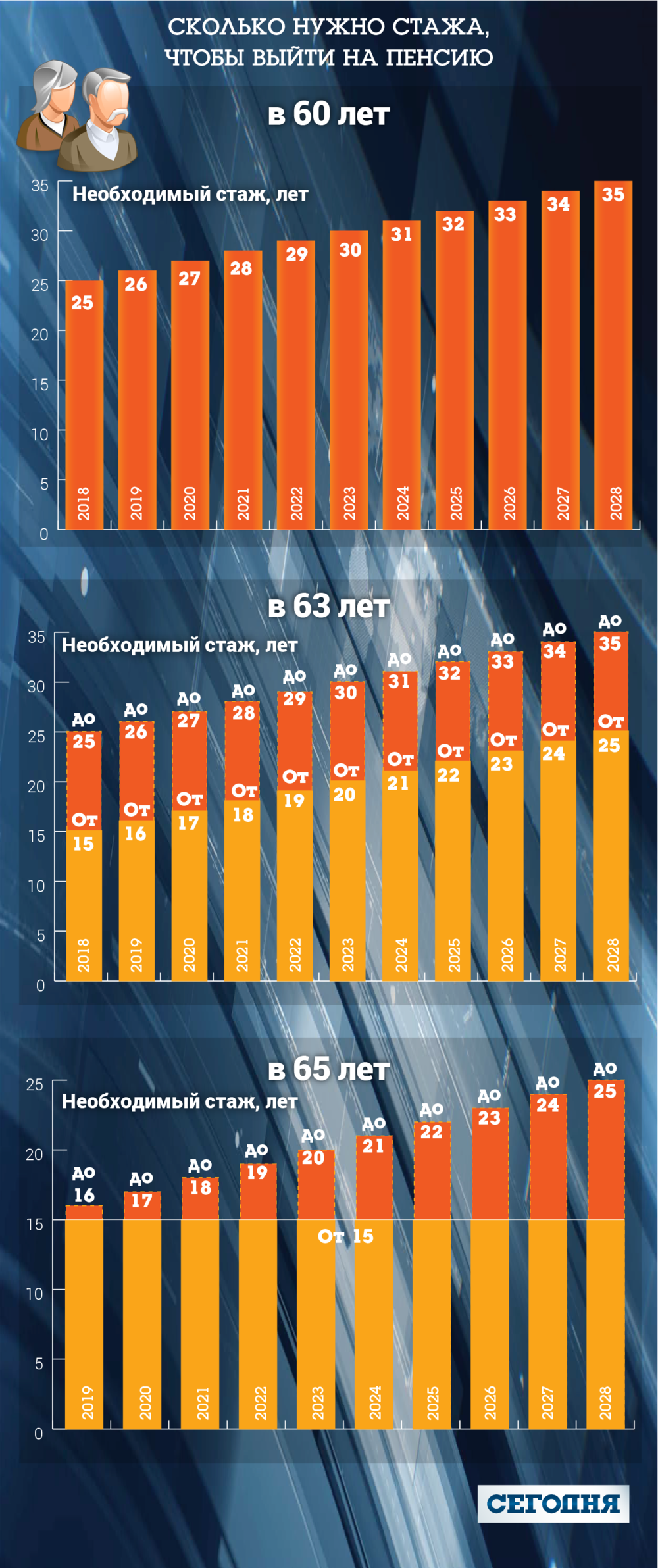 Минимальное требование для получения пенсии в 65 лет не меняется, его закрепили на уровне 15 лет. А вот требования для пенсии в 63 и 60 лет будут расти 10 лет, увеличиваясь с каждым годом на 12 месяцев. Так, в следующем году в 60 лет получить свою пенсию смогут украинцы с 25 годами стажа, а к 2028-му нужно отработать как минимум 35 лет.
