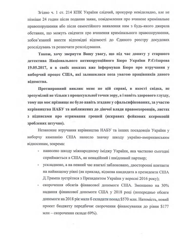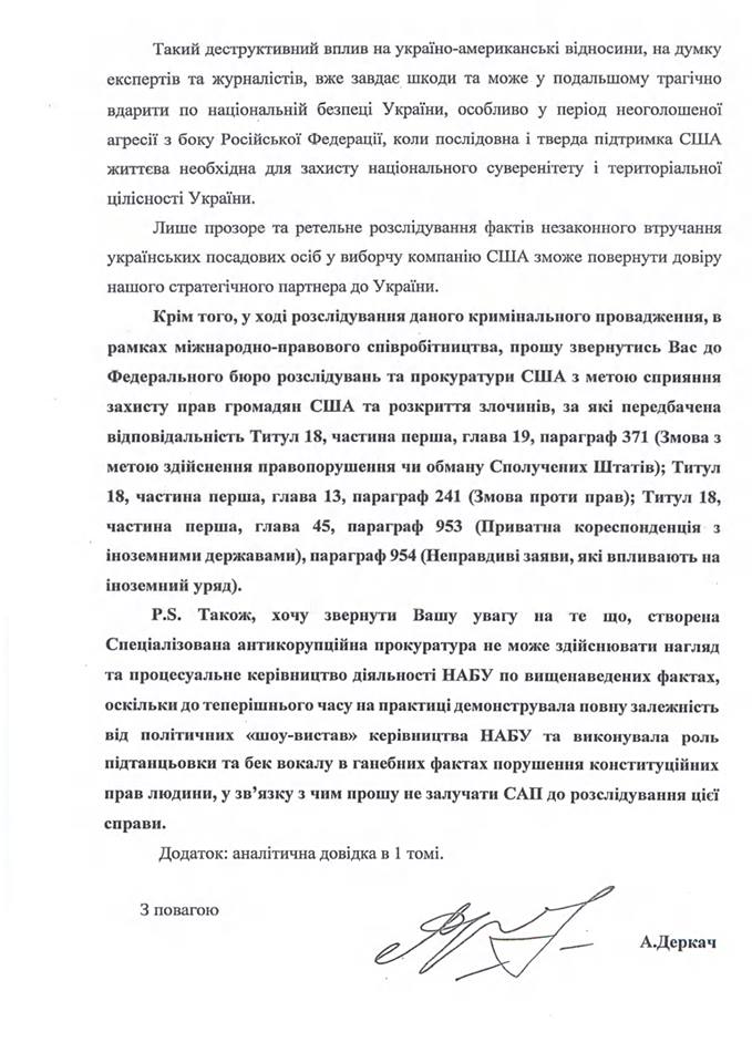 "По мнению экспертов и журналистов, в период необъявленной войны со стороны Российской Федерации последовательная и твердая поддержка США жизненно необходима для защиты национального суверенитета и территориальной целостности Украины. Только прозрачное и тщательное расследование фактов незаконного вмешательства украинских должностных лиц в избирательную кампанию США может восстановить доверие стратегического партнера к Украине", - резюмировал он.
