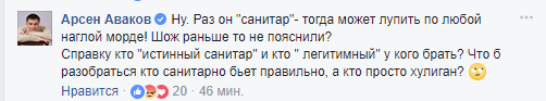 Справку кто "истинный санитар" и кто " легитимный" у кого брать? Что б разобраться кто санитарно бьет правильно, а кто просто хулиган?", - ответил Аваков.