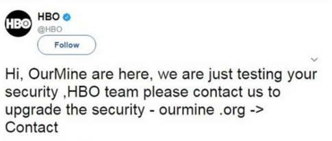 "Привет, это OurMine, мы лишь проверяем вашу безопасность. Команда HBO, свяжитесь с нами, пожалуйста, чтобы повысить безопасность", - говорилось в тексте сообщения.