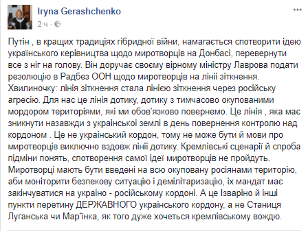По словам Геращенко, Путин поручает министру Лаврову подать резолюцию в Совбез ООН по миротворцам на линии соприкосновения, переиначивая понятия.