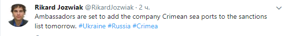 "Послы намерены завтра добавить компанию "Крымские морские порты" в санкционный список", - написал он.
