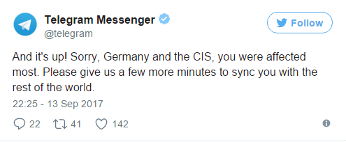 Telegram оперативно устранил проблемы с доступом к сервису, с которыми ранее столкнулись некоторые европейские пользователи. Об этом сообщается в официальном аккаунте мессенджера в Twitter.