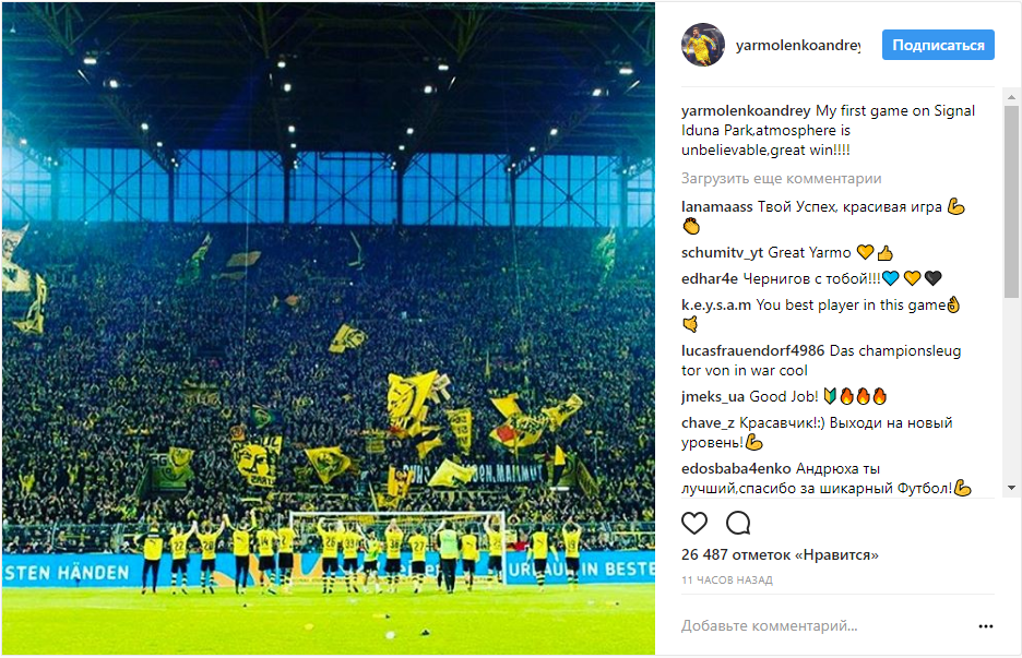 "Моя первая игра на "Сигнал Идуна Парк" – атмосфера невероятная. Прекрасная победа", – написал Ярмоленко в Instagram.