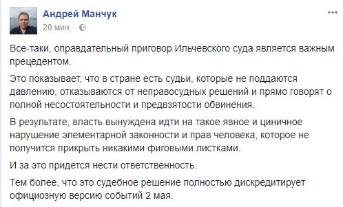 Андрей Манчук, журналист: "Все-таки, оправдательный приговор Ильчевского суда является важным прецедентом. Это показывает, что в стране есть судьи, которые не поддаются давлению, отказываются от неправосудных решений и прямо говорят о полной несостоятельности и предвзятости обвинения. В результате, власть вынуждена идти на такое явное и циничное нарушение элементарной законности и прав человека, которое не получится прикрыть никакими фиговыми листками. И за это придется нести ответственность. Тем более, что это судебное решение полностью дискредитирует официозную версию событий 2 мая".