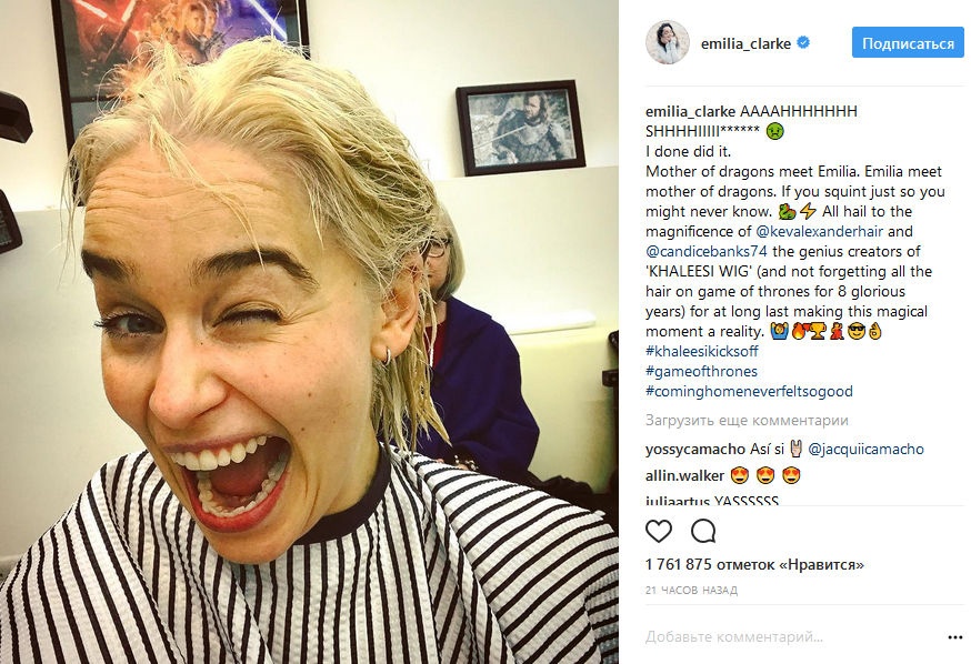 "О, черт. Я сделала это. Матерь драконов, познакомьтесь с Эмилией. Эмилия, познакомься с Матерью драконов", - шутливо подписала актриса фото из салона в процессе преображения.