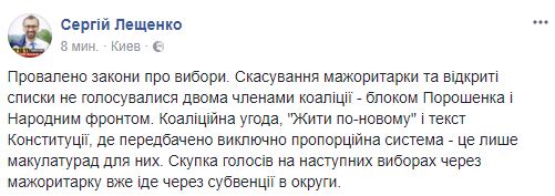 "Провалено законы о выборах. Отмена мажоритарки и открытые списки не голосовались двумя членами коалиции - блоком Порошенко и Народным фронтом. Коалиционное соглашение, "Жить по-новому" и текст Конституции, где предусмотрено исключительно пропорциональная система - это лишь макулатурад для них. Скупка голосов на следующих выборах через мажоритарку уже идет через субвенции в округа", - заявил Лещенко у себя в Facebook.