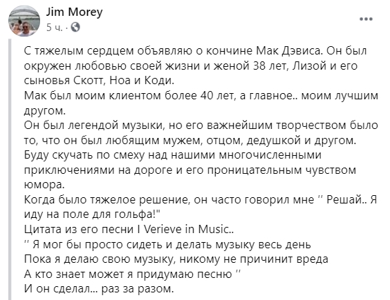"С тяжелым сердцем объявляю о кончине Мак Дэвиса. Он был окружен любовью всей своей жизни и женой 38 лет, Лизой и его сыновей Скотта, Ноа и Коди. Мак был моим клиентом более 40 лет, а главное, моим лучшим другом. Он был легендой музыки, но его важнейшим творчеством было то, что он был любящим мужем, отцом, дедушкой и другом. Буду скучать по смеху над нашими многочисленными приключениями и его проницательным чувством юмора", - поделился Джим Мори.
