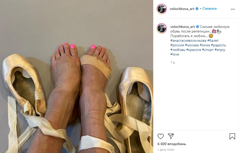 "Снимая любимую обувь после репетиции... Поработать я люблю...", - говорится в подписи к фото.