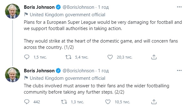 "Планы по созданию европейской Суперлиги могут нанести большой ущерб футболу, и мы поддерживаем футбольные власти в принятии мер [против этого]. Они нанесут удар в самое сердце отечественной игры и коснутся болельщиков по всей стране. Участвующие клубы должны ответить перед своими болельщиками и более широким футбольным сообществом, прежде чем предпринимать какие-либо дальнейшие шаги", — написал политик в Twitter.
